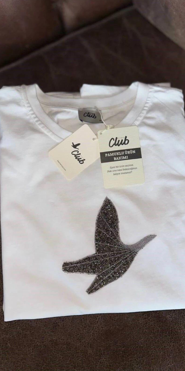 Beyaz Kuş Nakış Detaylı Taş İşlemeli Kadın Oversize Tişört