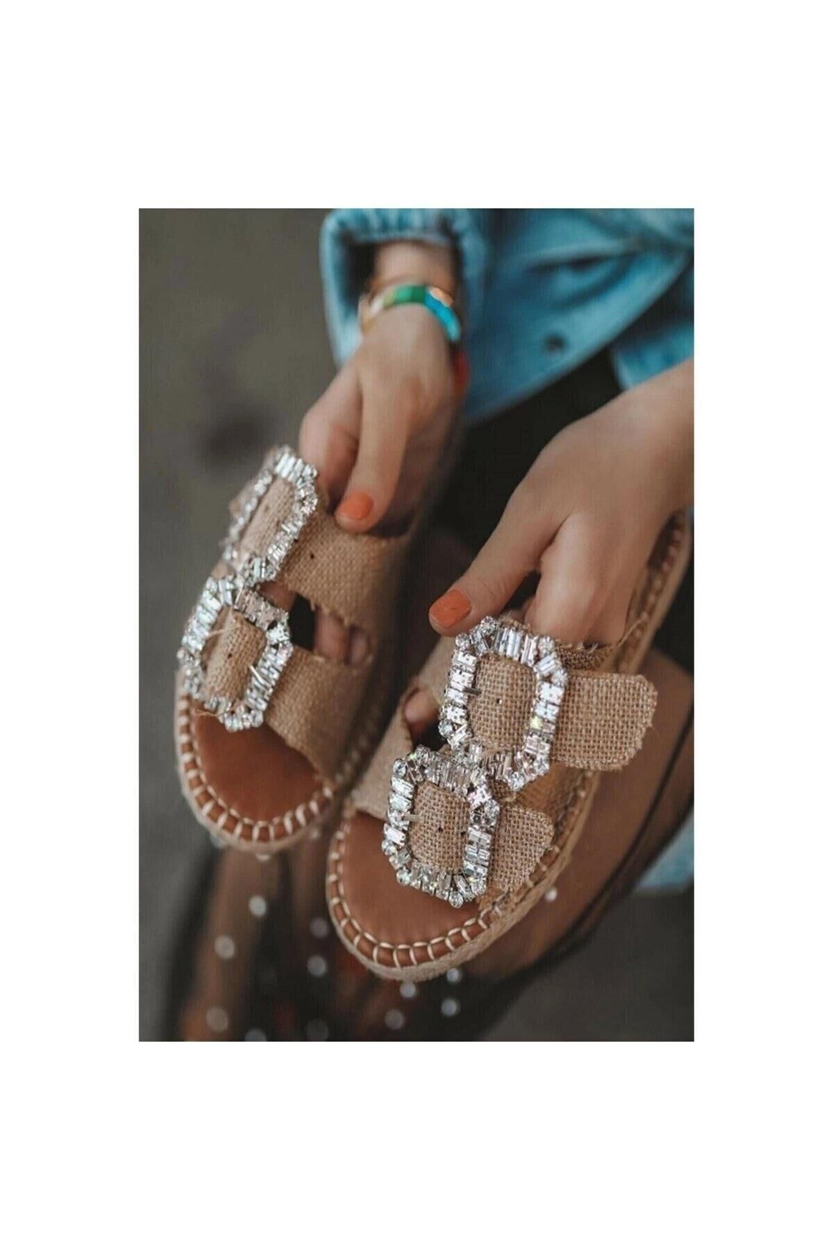 Hasır taş detayları ile göz alıcı görünüm sunar, yaz kombinlerinin vazgeçilmez tamamlayıcısıdır.