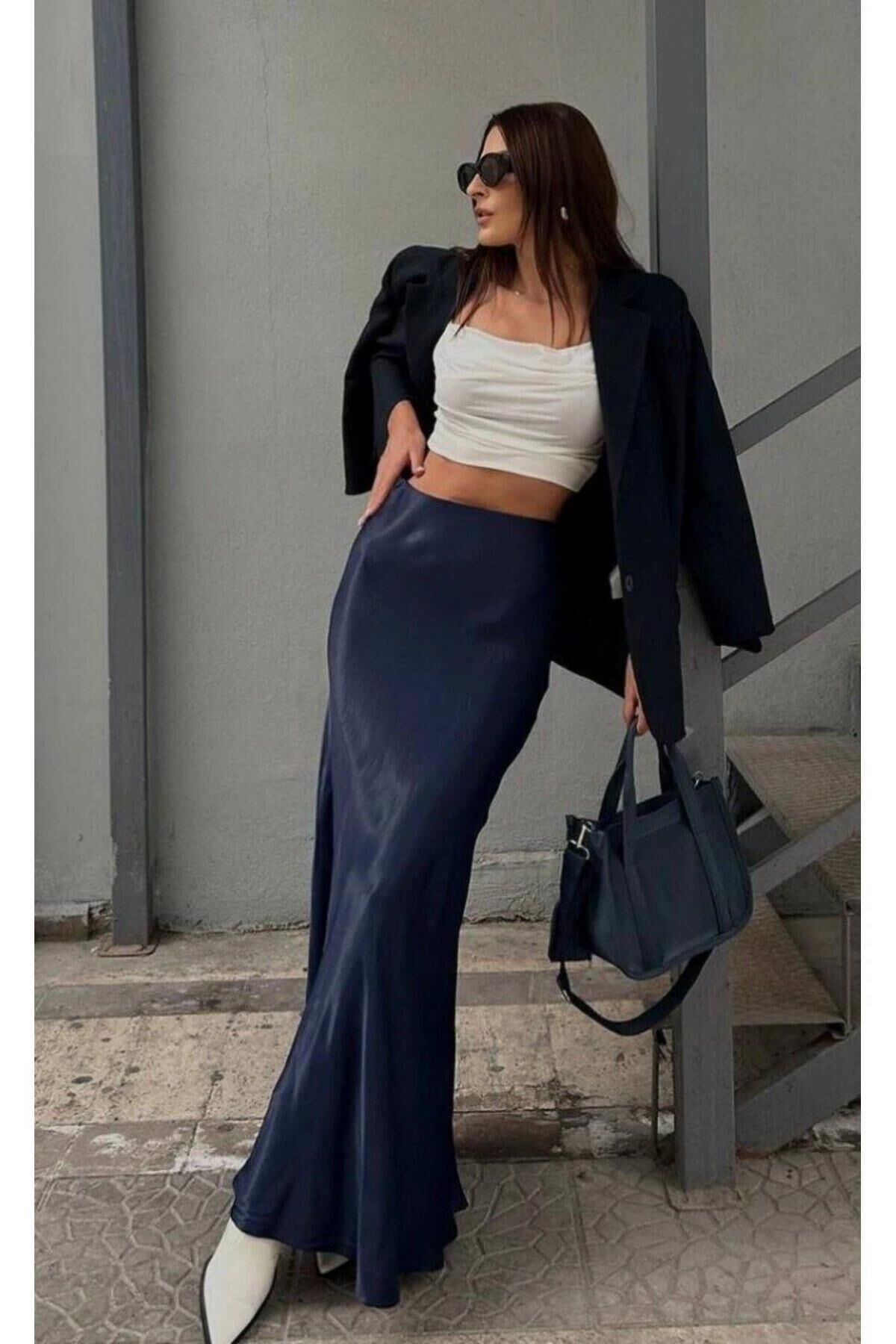 Kadın Lacivert Kloş Uzun Saten Etek