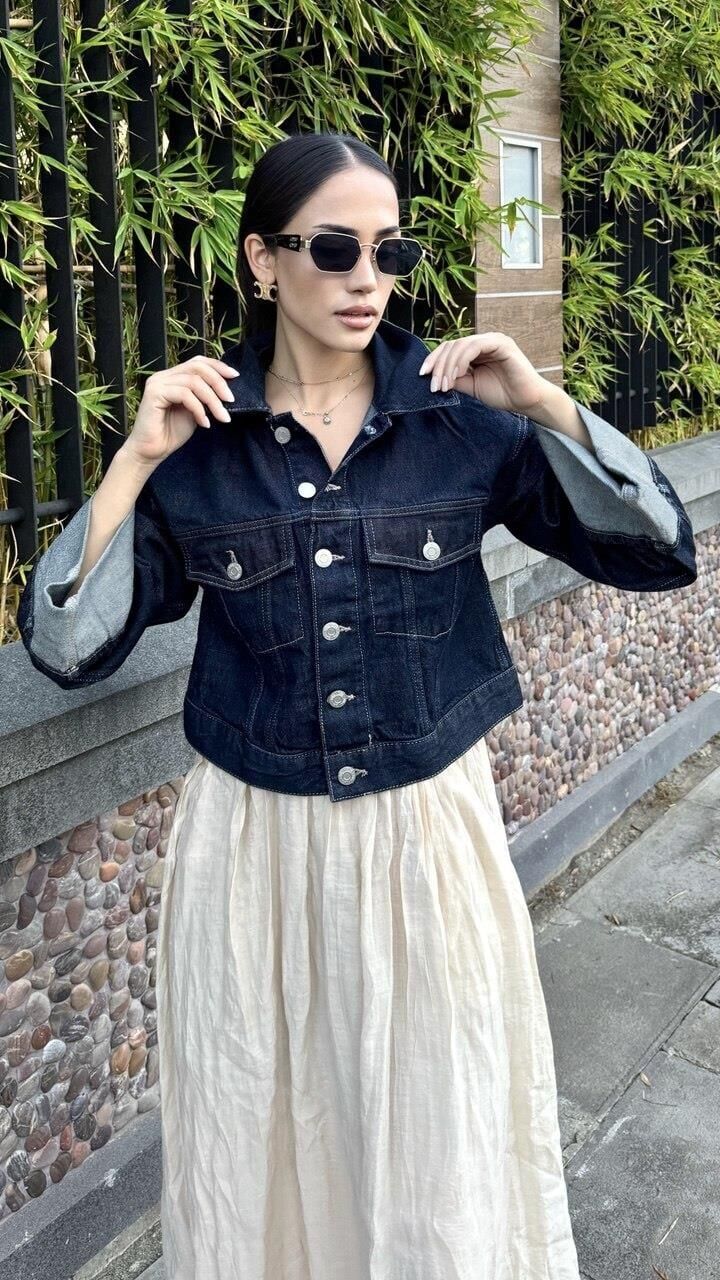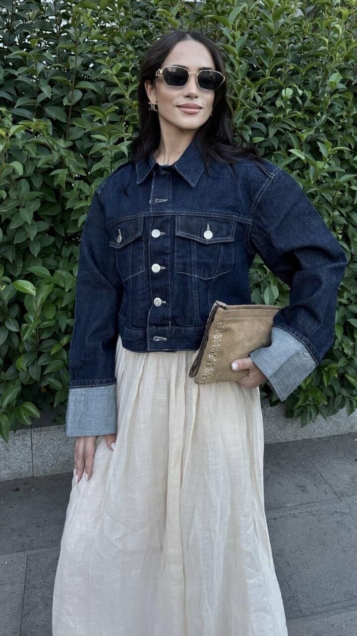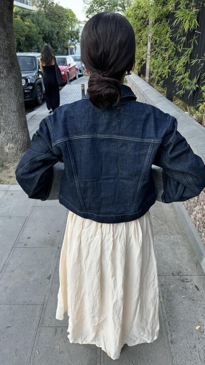 Dayanıklı pamuklu denim dokusu ve kol katlama detayıyla klasik ve sportif bir stil sunar. Elbise, etek veya pantolonlarla kombinlenerek günlük ve zamansız bir görünüm oluşturur.