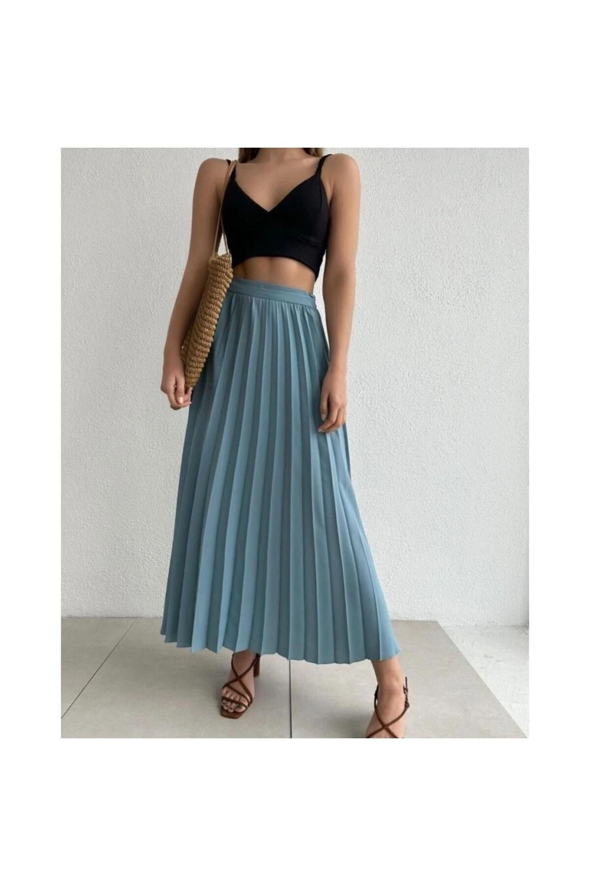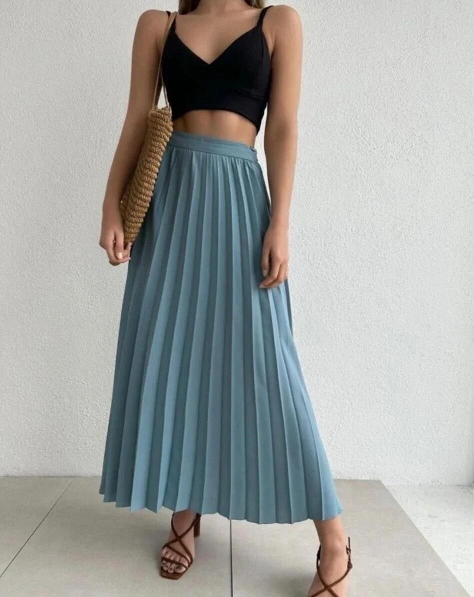 Akıcı pilise formu ve krem tonuyla hem ofis hem davet stilinde zarif ve aydınlık bir görünüm sunar. Gömlek, triko veya şık bluzlarla kombinlenebilir.