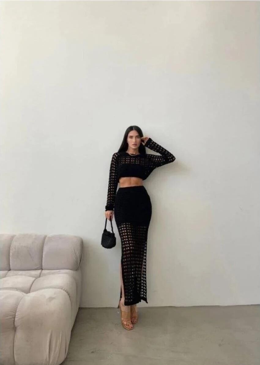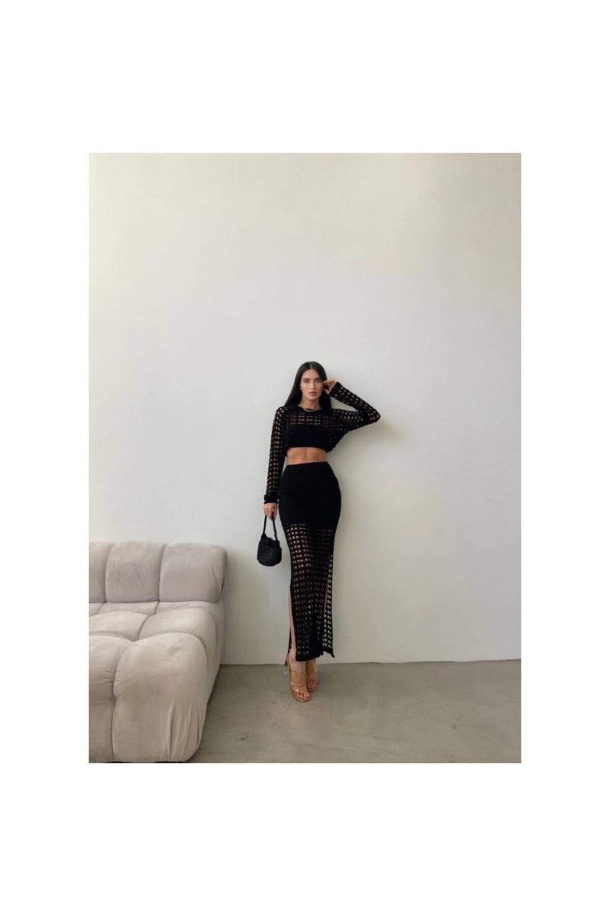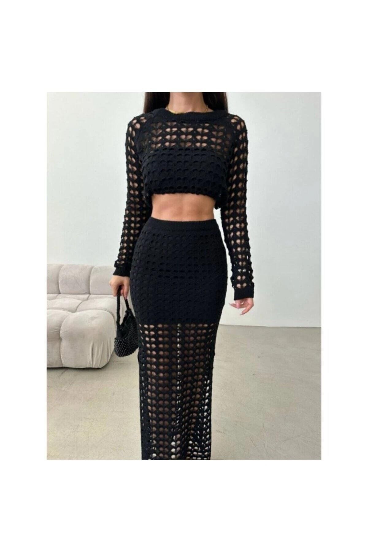 Ajur triko dokusu ve crop etek tasarımıyla modern ve feminen bir silüet sunan takım modelidir. Sandalet veya topuklu ayakkabıyla kombinlenerek yaz ve bahar stiline zarif bir dokunuş katar.
