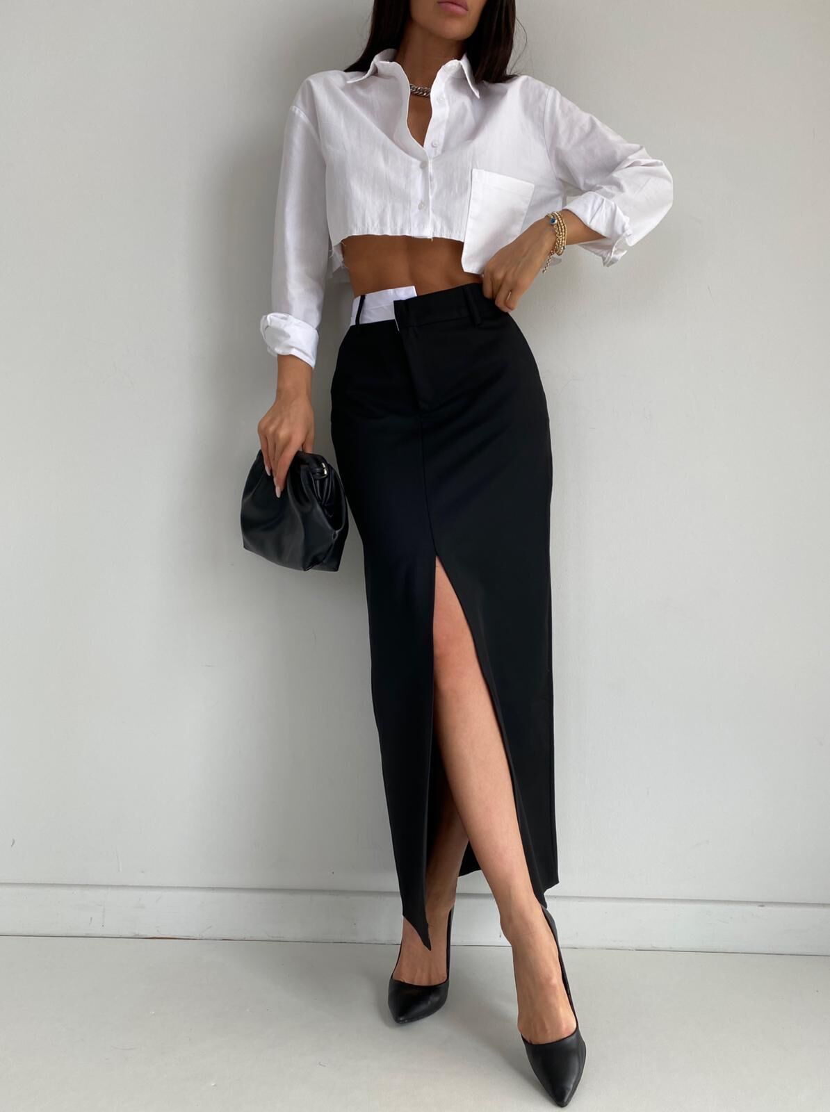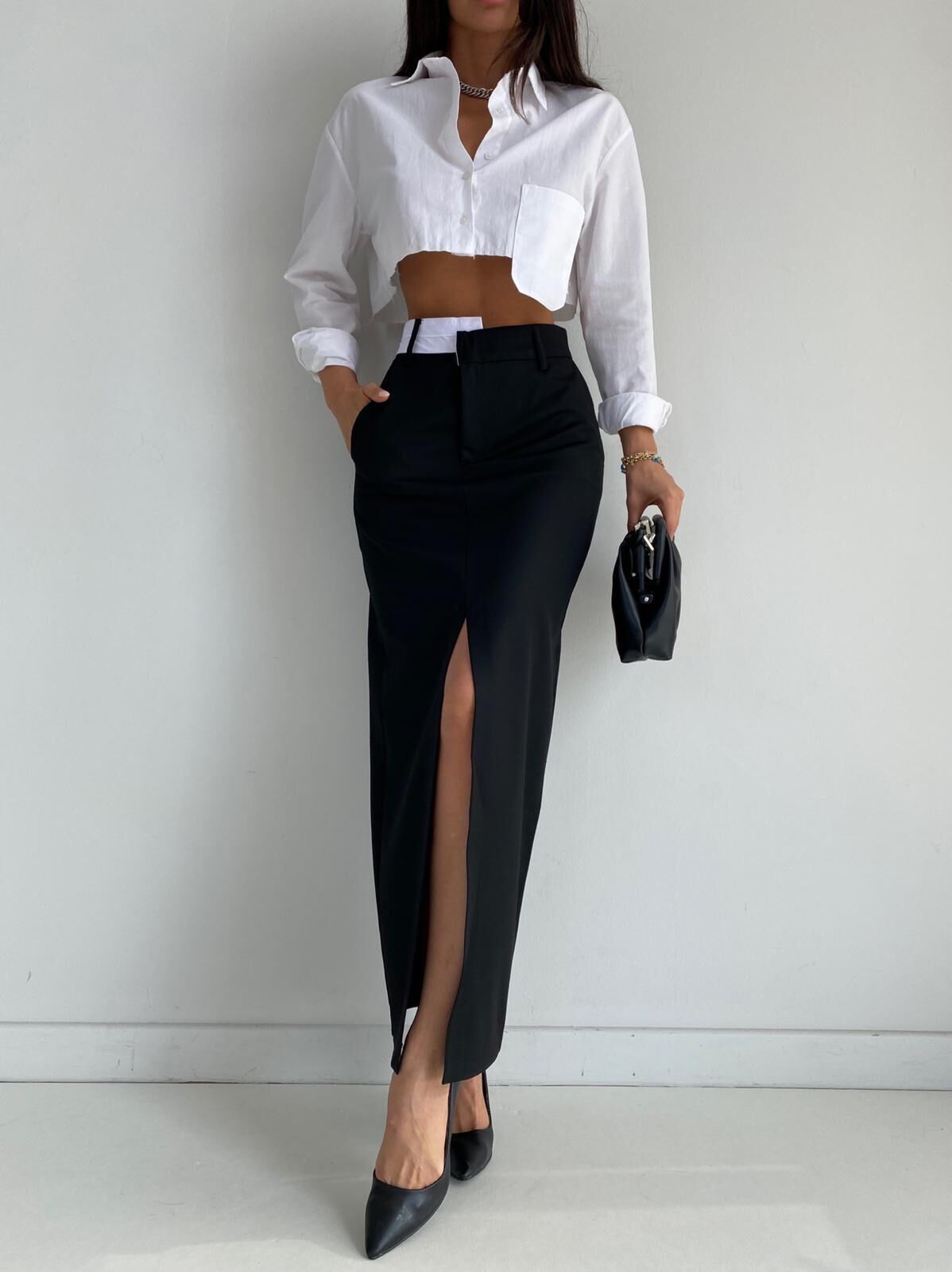 Ön yırtmaç detayı ve dikey çizgili dokusuyla feminen ve iddialı bir silüet sunar. Crop üst veya gömlekle kombinlenerek hem günlük hem şık stil oluşturabilirsiniz.