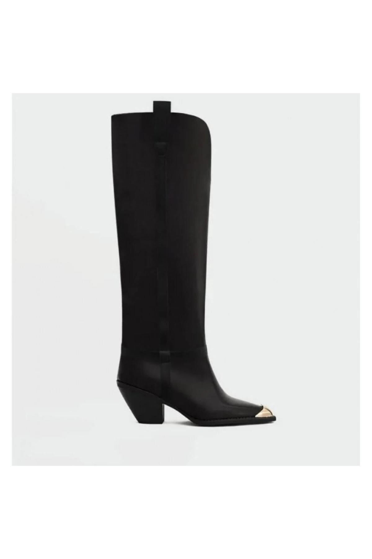 Gold detaylı siyah sivri burun çizme, bacak boyunu uzun ve ince gösteren zarif silüetiyle ofis şıklığından gece davetlerine kadar her anınıza lüks bir dokunuş katar.