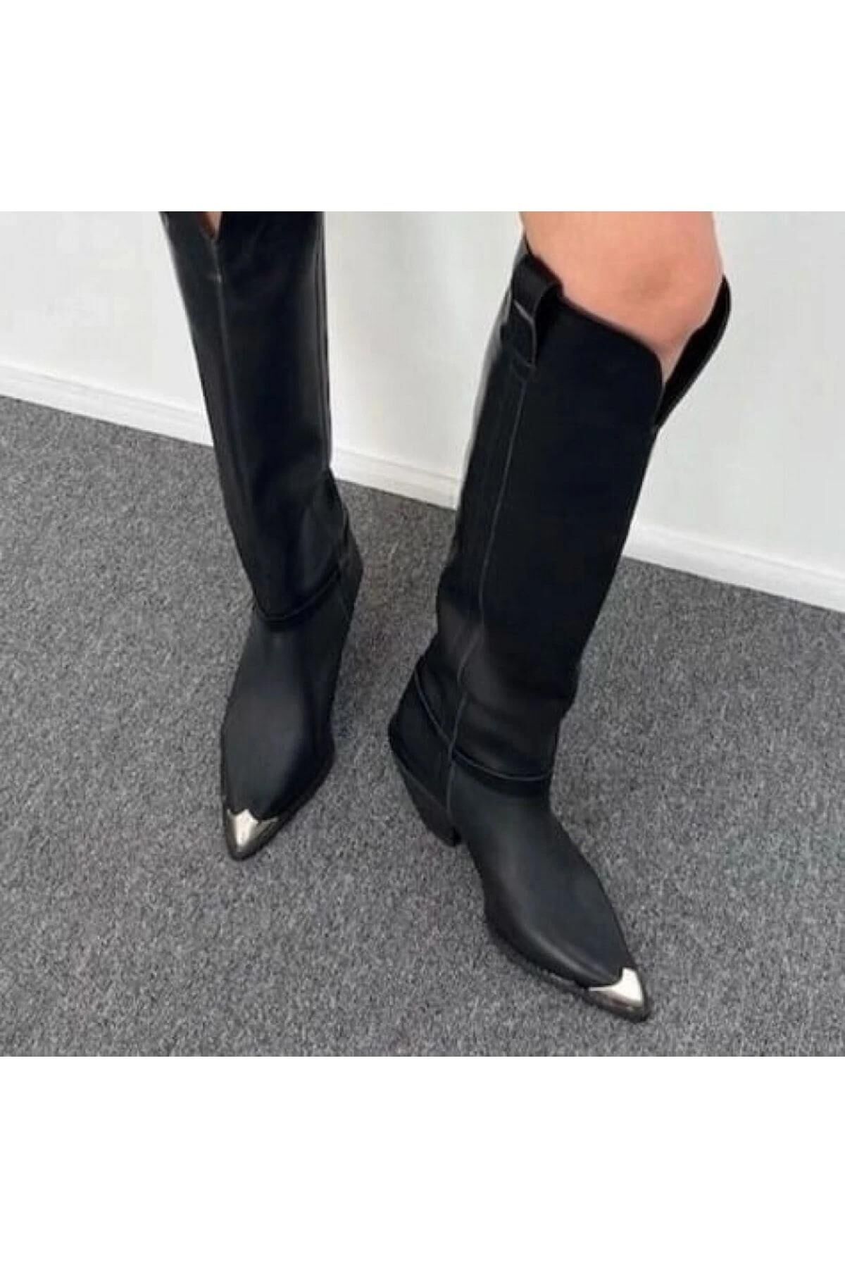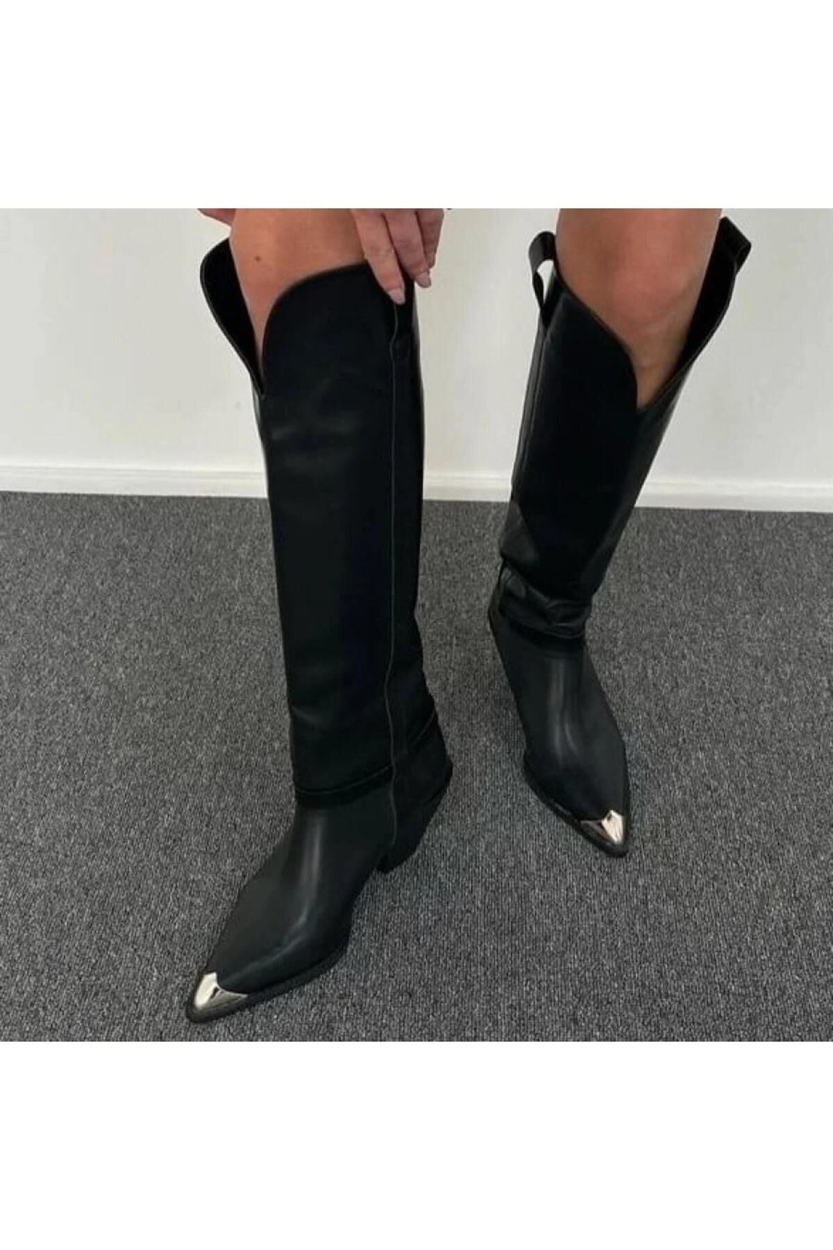 Siyah Gold Aksesuarlı Sivri Burun Deri Kadın Çizme