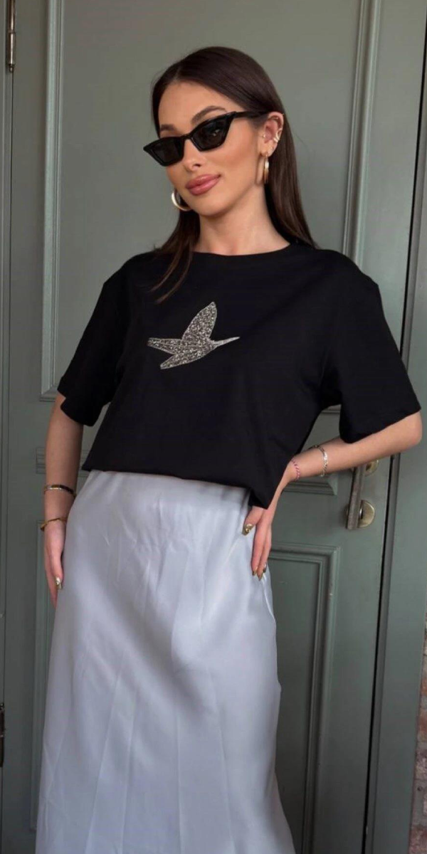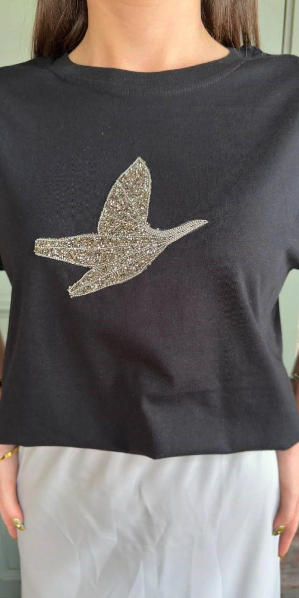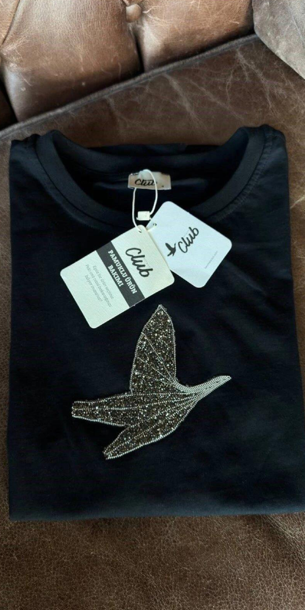 Geniş kesim oversize tasarımıyla gün boyu konfor sunar. Siyah kuş nakış detayları ve taş işlemeleriyle dikkat çeken bu model, basic silueti sayesinde jean, şort veya eteklerle kolayca kombinlenebilir. Günlük stilinize hem rahat hem sofistike bir dokunuş katar.