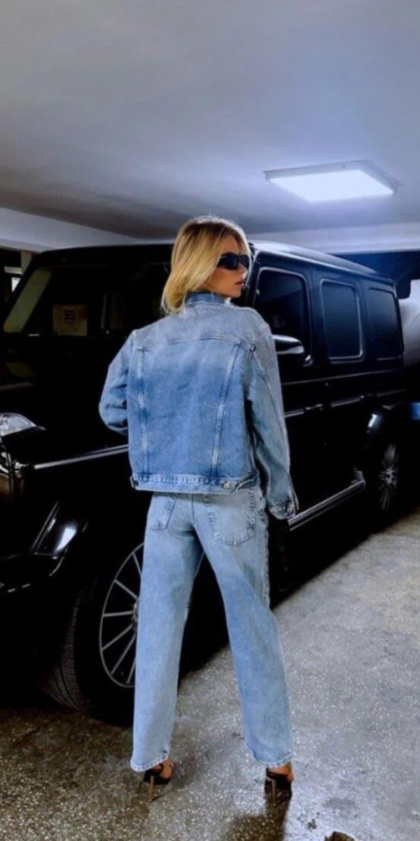 Işıltılı taş detayı ve geniş paça kesimiyle hem günlük hem gece kombinlerinde modern bir stil sunar. Basic tişört veya şık bluzlarla kombinlenebilir.