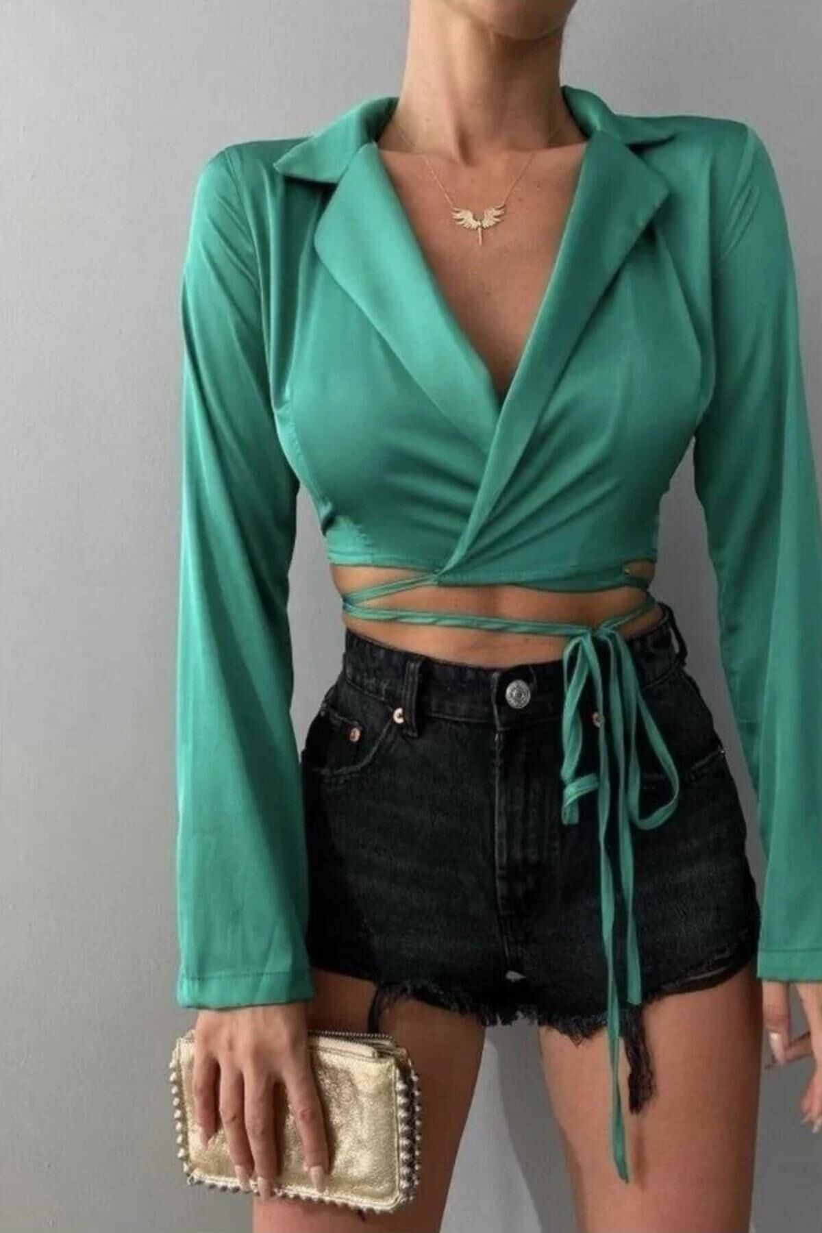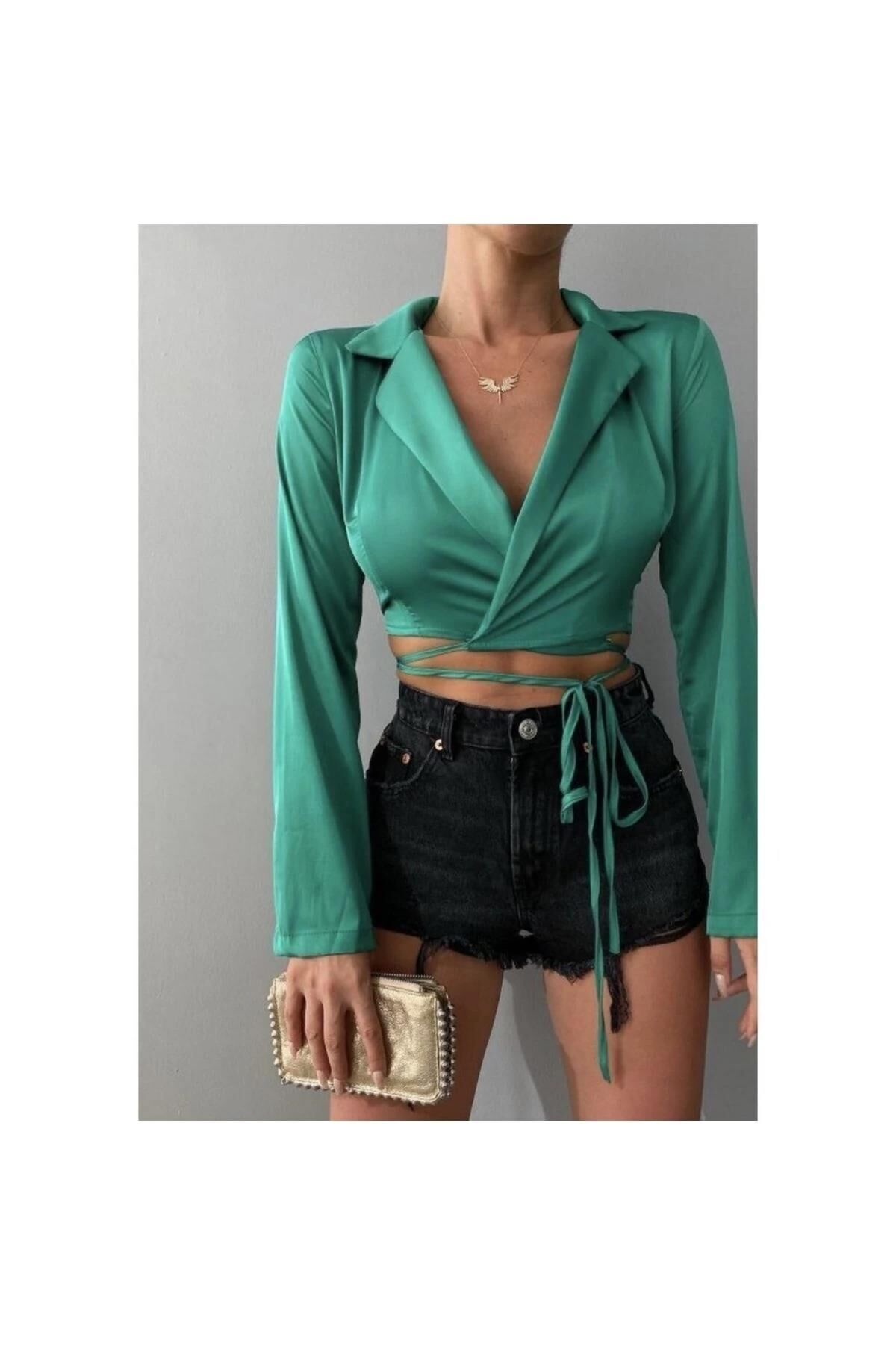 Yeşil ip bağlama detayıyla modern bir dokunuş sunan bu model, dayanıklı dokuma kumaşı sayesinde konfor ve şıklığı bir arada sunar. Regular kalıbı rahat hareket özgürlüğü sağlarken vücut hatlarını nazikçe sarar. Jean, kumaş pantolon veya eteklerle kolayca kombinlenerek hem günlük hem ofis stiline uyum sağlar.